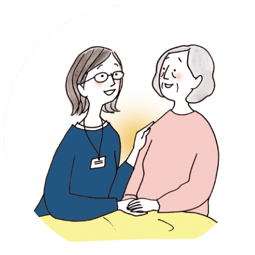- 介護をするときはついつい無言でテキパキと進めがちですが、「あなたのことを大切に思っています」と伝えるためには、その場に言葉をあふれさせることが必要です。ゆっくりとした穏やかな言葉は相手に安心を届けます。